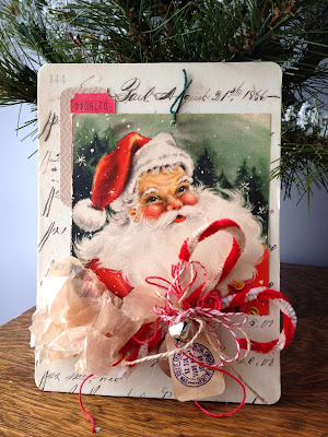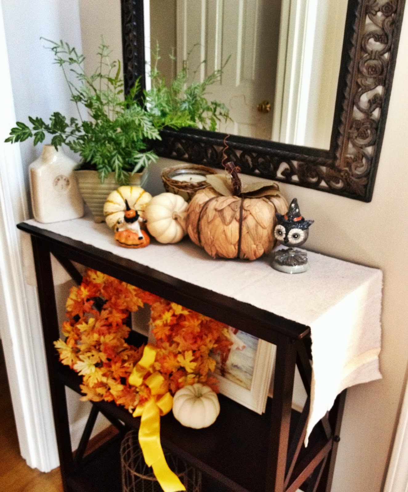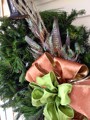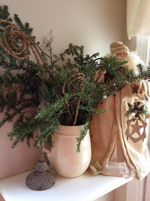 I decided I wanted a real wreath inside this year and this one leads to the back screened in porch. I found this Dear Santa ribbon at a local shop and added some of my favorite 'doodads' and those are glass owls-tiny ones hanging from the ribbon.