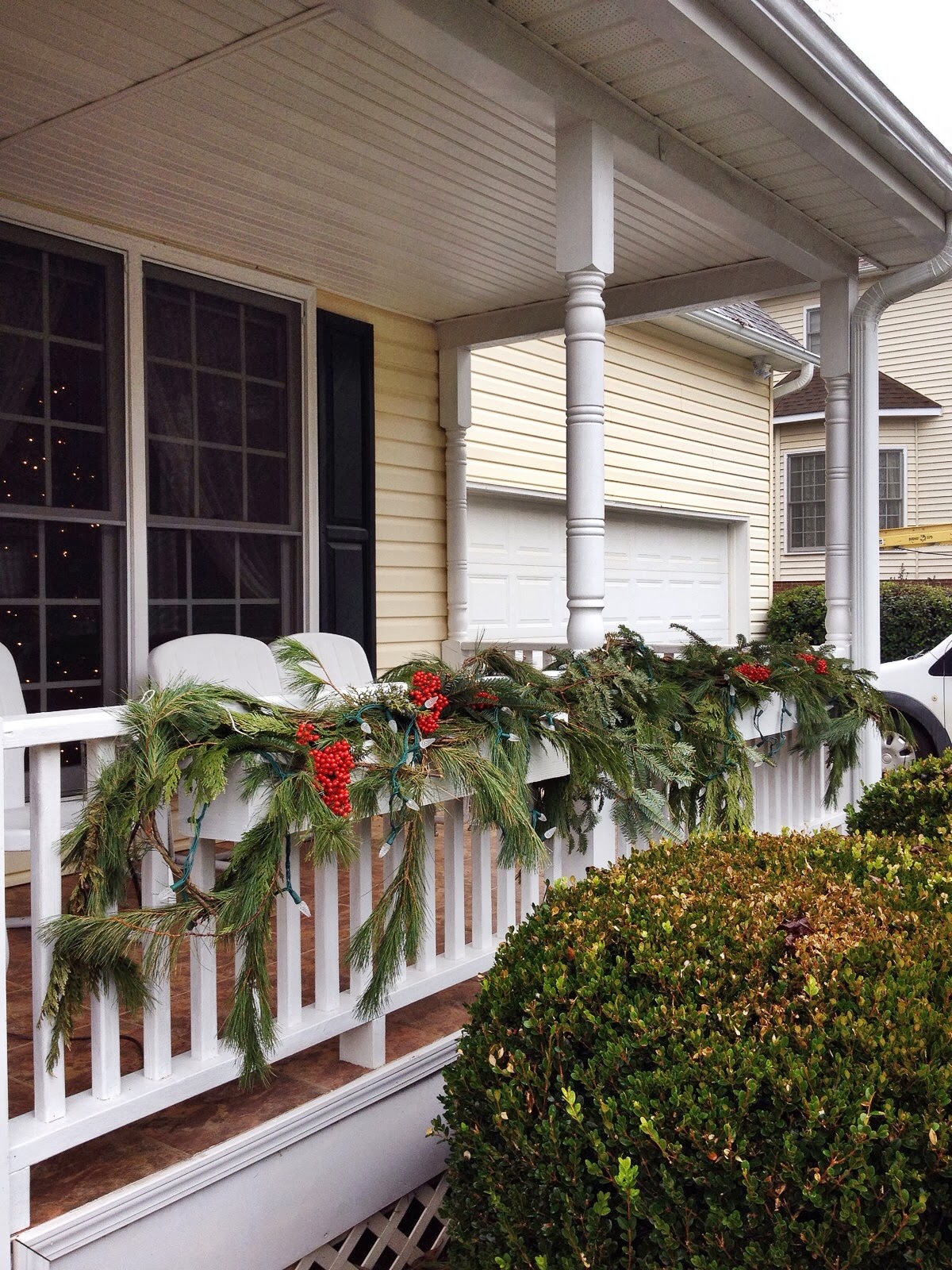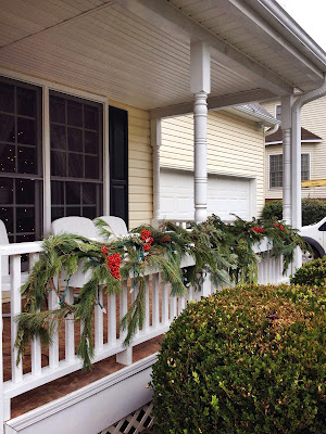 Sad to say goodbye to this porch and window boxes decorated with simply greenery and mucho bunches of holly berries from my Mom's holly bush. Please excuse the browning boxwood bushes.