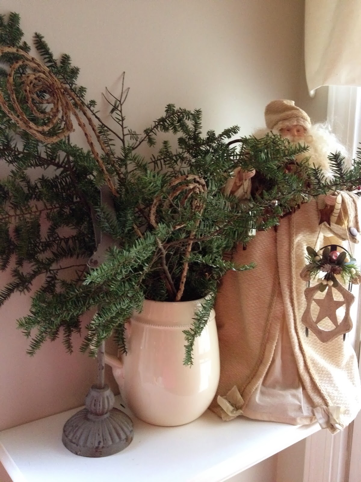 My vintage style Santa with greens in the eat in area.